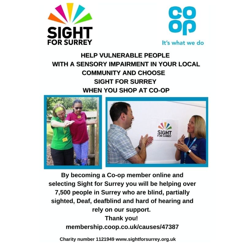 Calling into Co-op to grab a can of coke? Popping out to pick up a packet of peas for tea or visiting Co-op for that much needed mid-week top up shop? Fetcham based charity Sight for Surrey is urging all Surrey residents to support local people with a hearing or sight loss and choose Sight for Surrey when they shop at Co-op.