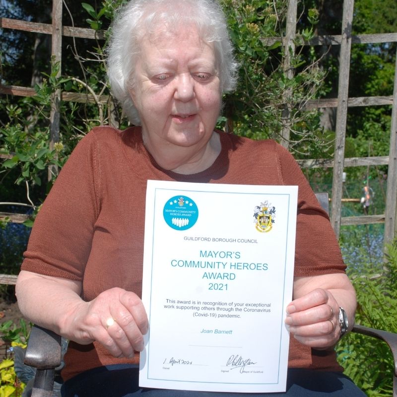 Joan Barnett, from Merrow, has been awarded one of the Mayor of Guildford’s prestigious Community Hero Award for the outstanding volunteer work she has provided to Sight for Surrey during the Coronavirus pandemic.