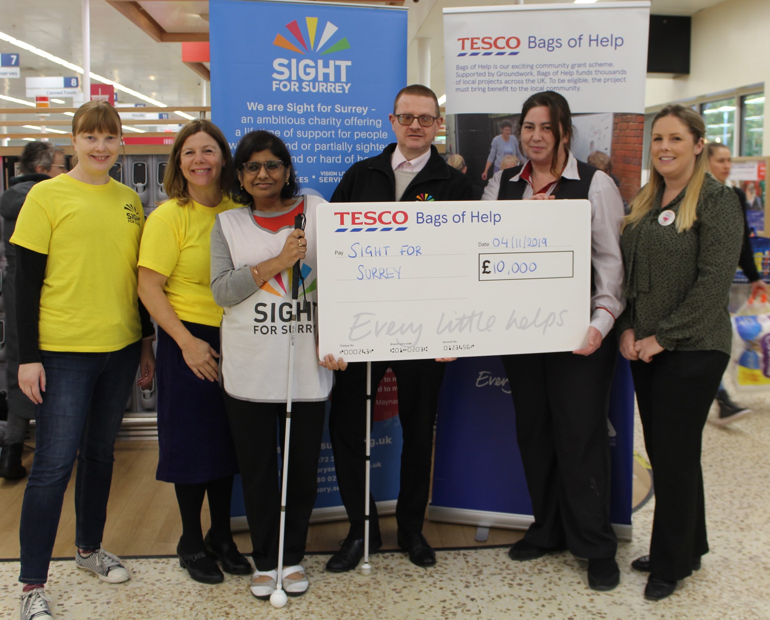 Sight for Surrey has scooped £10,000 in Tesco’s Bags of Help Centenary Grants Initiative. The cash will go directly to the heart of the organisation, providing emotional and practical support for those with a sight impairment or combined sight/hearing impairment in Surrey.