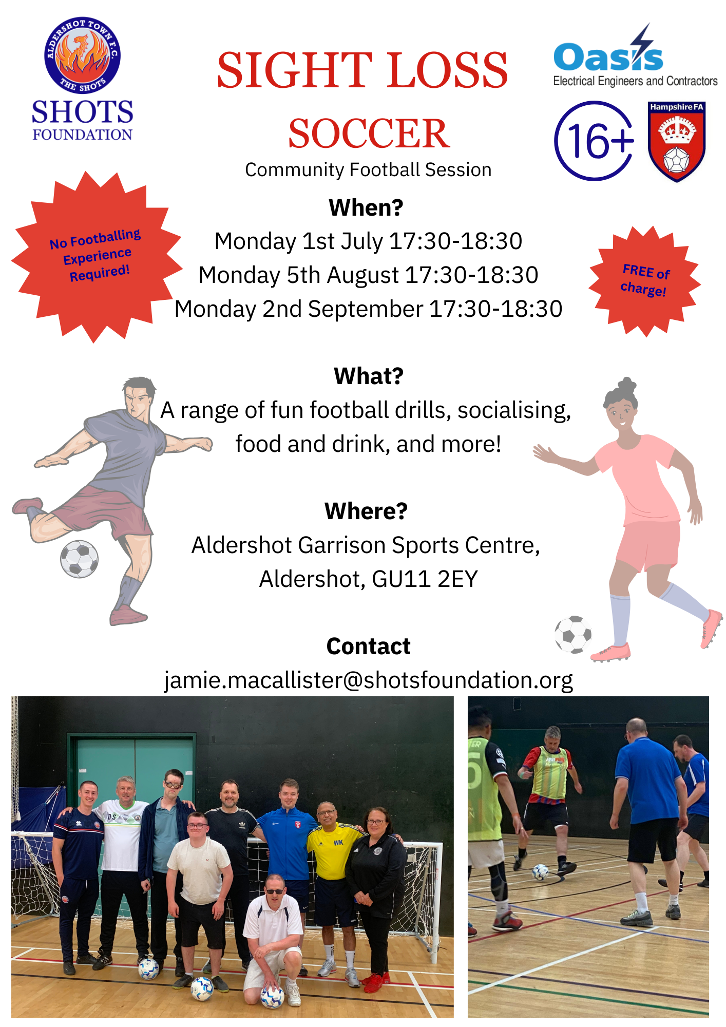 Sight Loss Soccer are community football sessions held at Aldershot Garrison Sports Centre, Aldershot, GU11 2EY on the following dates: